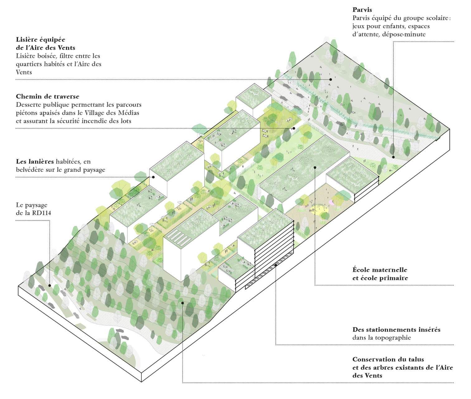 La construction des 700 logements destinés aux journalistes durant l’été 2024, et des 600 logements supplémentaires, du gymnase et de l’école qui complèteront le nouveau quartier après la compétition, est réalisée dans les parties hautes du site, au nord de l’entrepôt logistique et en frange de l’Aire des Vents. Le projet adopte un principe d’intervention minimum sur le nivellement existant, préservant la majeure partie du système de talus routiers plantés qui constituent une trame écologique à travers le site et délimitent les deux plateaux habités. Cela implique de repousser les immeubles vers l’intérieur surélevé des îlots et de ménager seulement des terrassements minimes pour des rampes d’accès. Enfin, le dessin des îlots a été pensé avec un maximum de porosité et une imperméabilisation limitée (30% minimum de pleine terre par lots) afin de pouvoir conserver les dynamiques actuelles du sol, tant du point de vue hydrologique que des parcours de biodiversité. Le village est ainsi organisé selon trois typologies d’îlots traversants dont les jardins constituent à la fois des habitats et des parcours pour les espèces qui passent du parc Georges Valbon vers l’Aire des Vents : les lanières, les îlots jardins et les plots en terrasse dans la partie en pente qui permet de passer du niveau bas au niveau haut. Cette stratégie de transformation produit une forme urbaine discontinue, parcourue par une série de lisières avec des ruptures de niveaux, qui permet notamment d’organiser la gestion des eaux pluviales par bassins versants d’infiltration, et renforcer ainsi la présence de l’eau et du vivant dans l’ensemble du quartier.