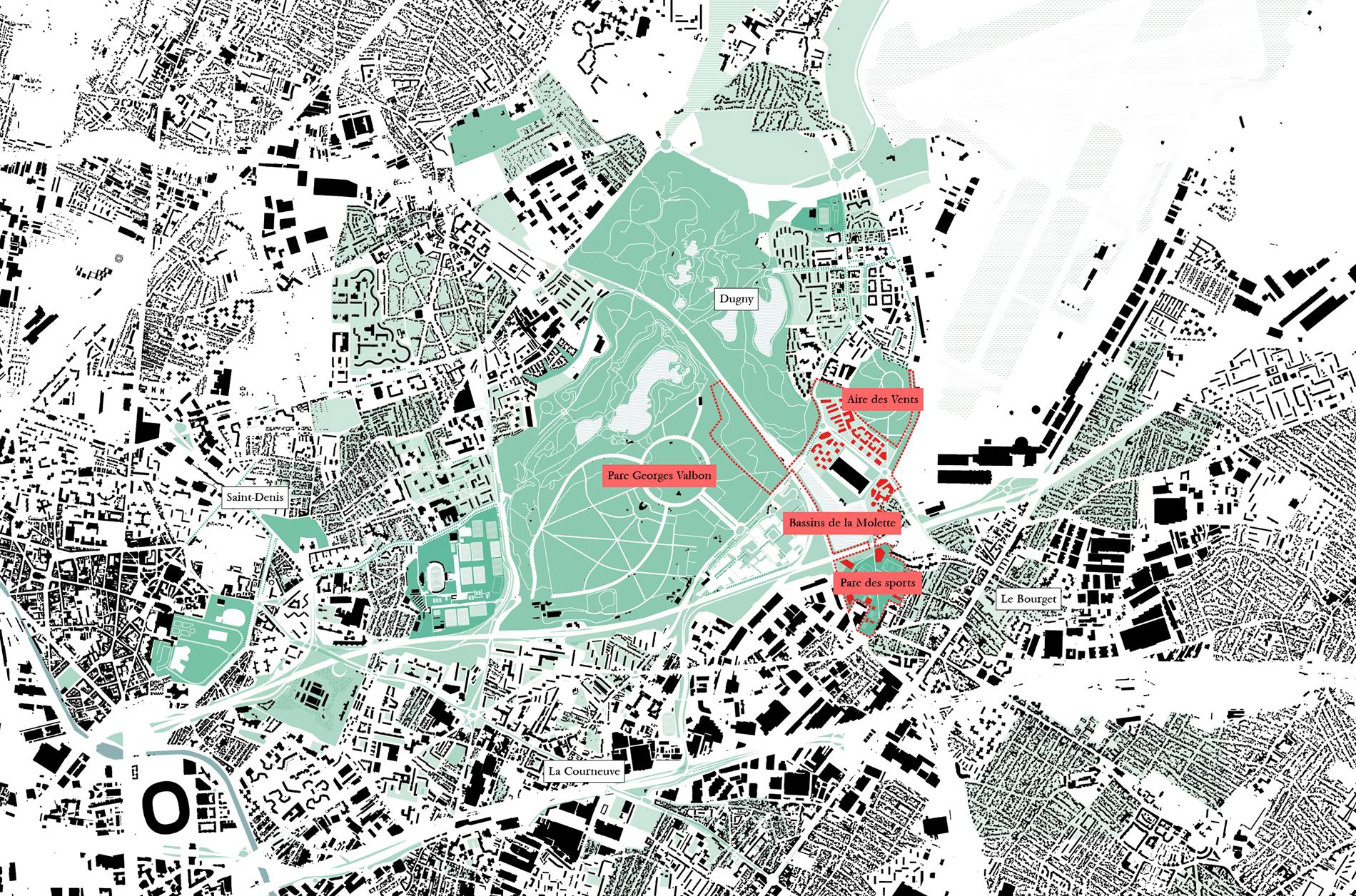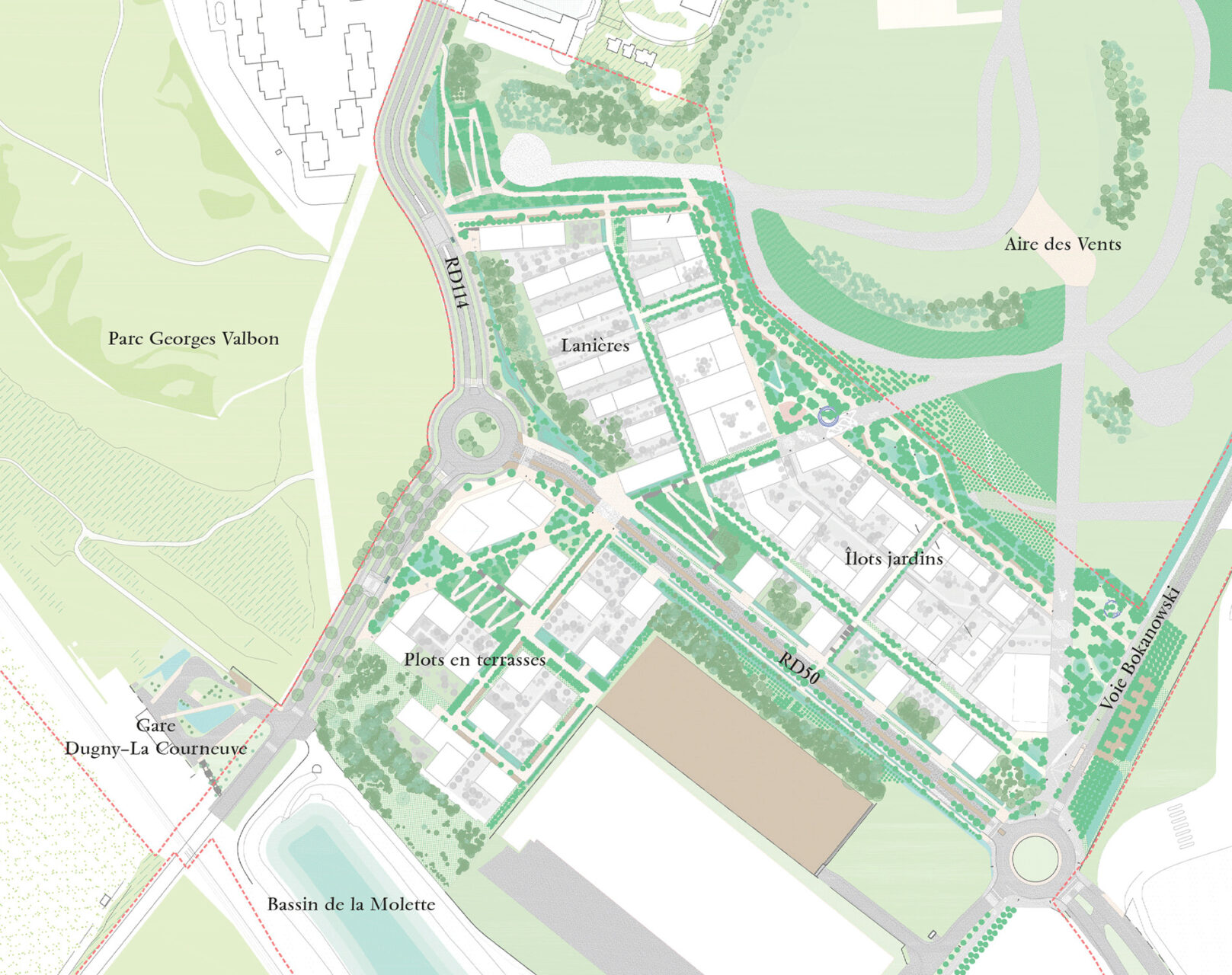 La morphologie des cités-jardins historiques était conçue selon un plan global qui intègre espaces publics, espaces plantés et cultivés, et formes bâties. Ce schéma pensé du point de vue humain, suivant des règles de composition urbaine classiques ou pittoresques, impose une géométrisation du sol qui est vu comme une matière à modeler, terrasser, planter, déplacer ou remplacer par des artefacts humains (routes, égouts, réseaux, fondations, potagers, terrains de sport, parcs…). Dans le cas du Village des médias, à l’inverse, la posture de départ était d’ancrer au maximum les transformations dans les caractéristiques du sol hérité. Le site comporte deux parties séparées par un dénivelé. La partie basse est située au nord-est de l’ancienne plaine maraîchère des Vertus, où coule le ru de la Molette. Cette plaine a accueilli dans les années 1970 les terres issues de l’excavation du trou des Halles, qui ont donné naissance au paysage du parc Georges Valbon. Cette partie basse est occupée par la friche militaire du Terrain des Essences, ancien stockage d’hydrocarbures de l’armée enclavé dans le parc, les bassins de rétention de la Molette et les zones humides du Vallon écologique. La partie haute se situe sur le plateau de Dugny où a été aménagé l’aéroport du Bourget et l’espace événementiel de l’Aire des Vents. Les deux parties sont traversés par des infrastructures : la voie ferrée de l’ancienne Grande Ceinture réactivée par la ligne 11 de tramway, les routes départementale D50 et D114, et un grand entrepôt logistique, qui constituent à la fois des ruptures et des liens pour l’habitation de la faune et de la flore mais aussi les parcours humains. Dans l’optique de préserver le capital végétal et animal existant et de rétablir des continuités écologiques et urbaines, plusieurs choix structurants ont été faits. Tout d’abord, celui de ne pas construire de manière pérenne sur le Terrain des Essences comme prévu, mais d’en dépolluer le sol pour accueillir le stand des épreuves de tir durant l’été 2024, avant de réintégrer l’enclave dans le parc. Son aménagement paysager après les Jeux permettra de créer une continuité de zones humides, du bassin de la Molette jusqu’au cœur du parc Georges Valbon, et d’étendre ainsi l’habitat d’oiseaux et d’amphibiens protégés, notamment le blongios nain, le butor étoilé ou le crapaud calamite.