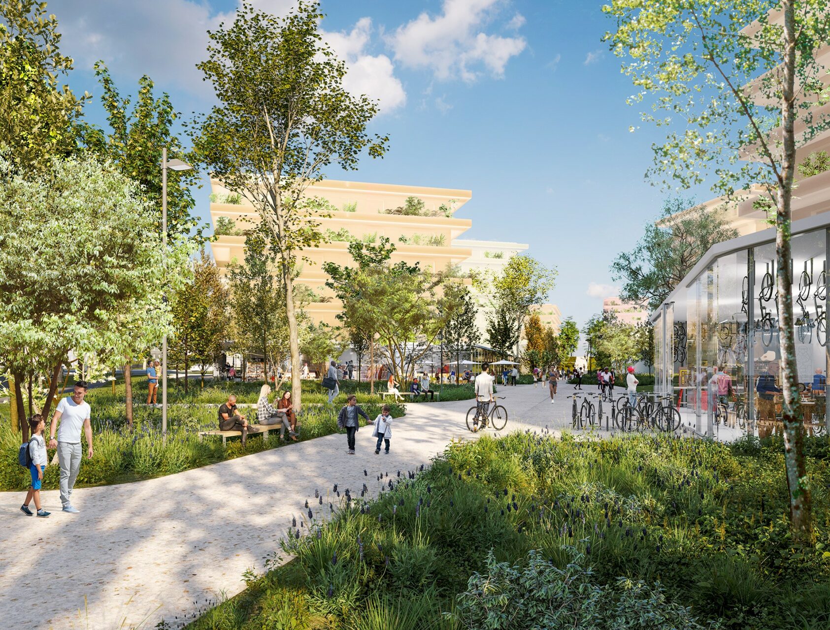 Comment concilier habitats humains et habitats non-humains ? C’est la question qui résume le défi posé par le « Village des médias » sur lequel TVK a travaillé depuis 2015. Ce projet urbain, situé sur les communes du Bourget, de Dugny et de la Courneuve, est destiné à accueillir les journalistes du monde entier durant les Jeux à l’été 2024, au sein d’un quartier de logements qui seront ensuite réutilisés pour des habitations ordinaires, après que leur aménagement intérieur aura été adapté. Le périmètre de l’étude s’étend sur 80 hectares en limite du parc départemental Georges Valbon, classé comme site Natura 2000, notamment pour ses milieux humides exceptionnels. C’est un site de lisière, d’échanges entre espaces bâtis et espaces ouverts. Si le terrain est le lieu d’une biodiversité extraordinaire et accueille des espèces rares et protégées, le défi du projet urbain est d’y concilier un objectif de densification et d’intensification importantes avec une ambition d’exemplarité écologique. La collaboration dès le début du projet avec une écologue, Marine Linglart, a permis de décentrer les principes de conception anthropocentrés vers une architecture qui soit partagée entre humains et non-humains. L’esquisse s’est portée sur des formes urbaines discontinues, entrecoupées de zones plantées et d’espaces publics qui décuplent les interfaces avec l’environnement. L’appellation « cité–jardin du XXIe siècle » apparaît en 2019 dans la communication institutionnelle et commerciale de l’aménageur du site, la Solideo. Ce mot d’ordre a permis de fédérer l’ensemble des acteurs autour d’objectifs d’excellence environnementale, et a favorisé une diversification des formes bâties pour s’approcher plus des qualités des cités-jardins historiques.